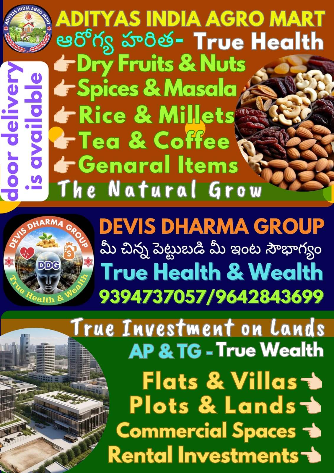 To enrich every life with the essence of True Health and True Wealth —To enrich every life with the essence of True Health and True Wealth — by providing pure, naturally grown groceries such as Dry Fruits, Nuts, Spices, Masala, Rice, Millets, Tea, Coffee Powders and Beauty Products that nurture wellbeing, while creating sustainable opportunities for growth through trusted properties — Plots, Flats, Villas, Commercial & Retun the Rental Income Spaces, Lands and Farm Lands that build a foundation for lasting prosperity.by providing pure, naturally grown groceries such as dry fruits, nuts, spices, rice, millets, and tea that nurture wellbeing, while creating sustainable opportunities for growth through trusted properties — Plots, Flats, Villas, Commercial & Retun the Rental Income Spaces and Lands. that build a foundation for lasting prosperity..